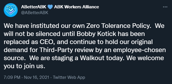 – Vi har innført vår egen nulltoleranse-policy. Vi vil ikke slutte før Bobby Kotick er byttet ut som toppsjef, og vi fortsetter å holde på våre opprinnelige krav om en gjennomgang av en tredjepart valgt av de ansatte, skriver en ansattgruppe i sosiale medier.