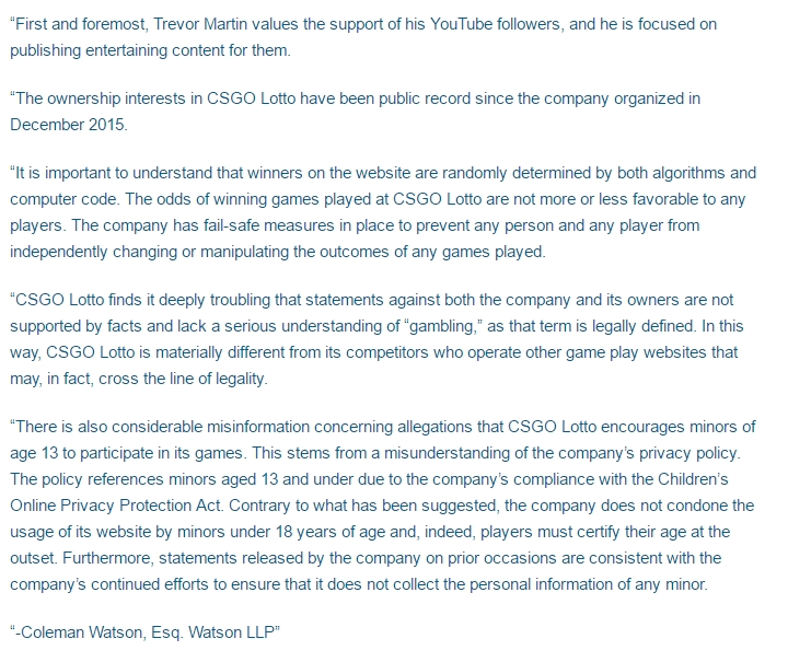 I en pressemelding skriver advokatene til Martin at de tar sterk avstand fra påstandene om juks med vinnersjanser på CSGOLotto – noe det ikke har vært belegg for å tro.
