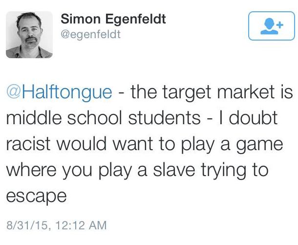 – Målgruppa er ungdomsskoleelever. Jeg tviler på at rasister vil ønske å spille et spill der du er en slave som forsøker å rømme, mener direktøren.