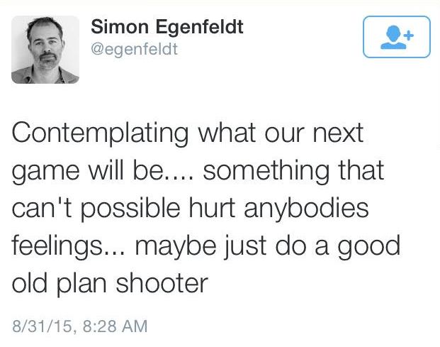 – Tenker på hva vårt neste spill skal bli … noe som umulig kan skade noens følelser… Kanskje et godt, gammeldags skytespill?