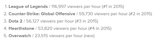 Ut i fra tallene ser vi at «CS:GO» hadde den største samlingen med samtidige seere, med nesten én million, tett fulgt av «League of Legends», mens «Dota 2», «Battlefield 1» og «Hearthstone» runder av topp fem-lista.