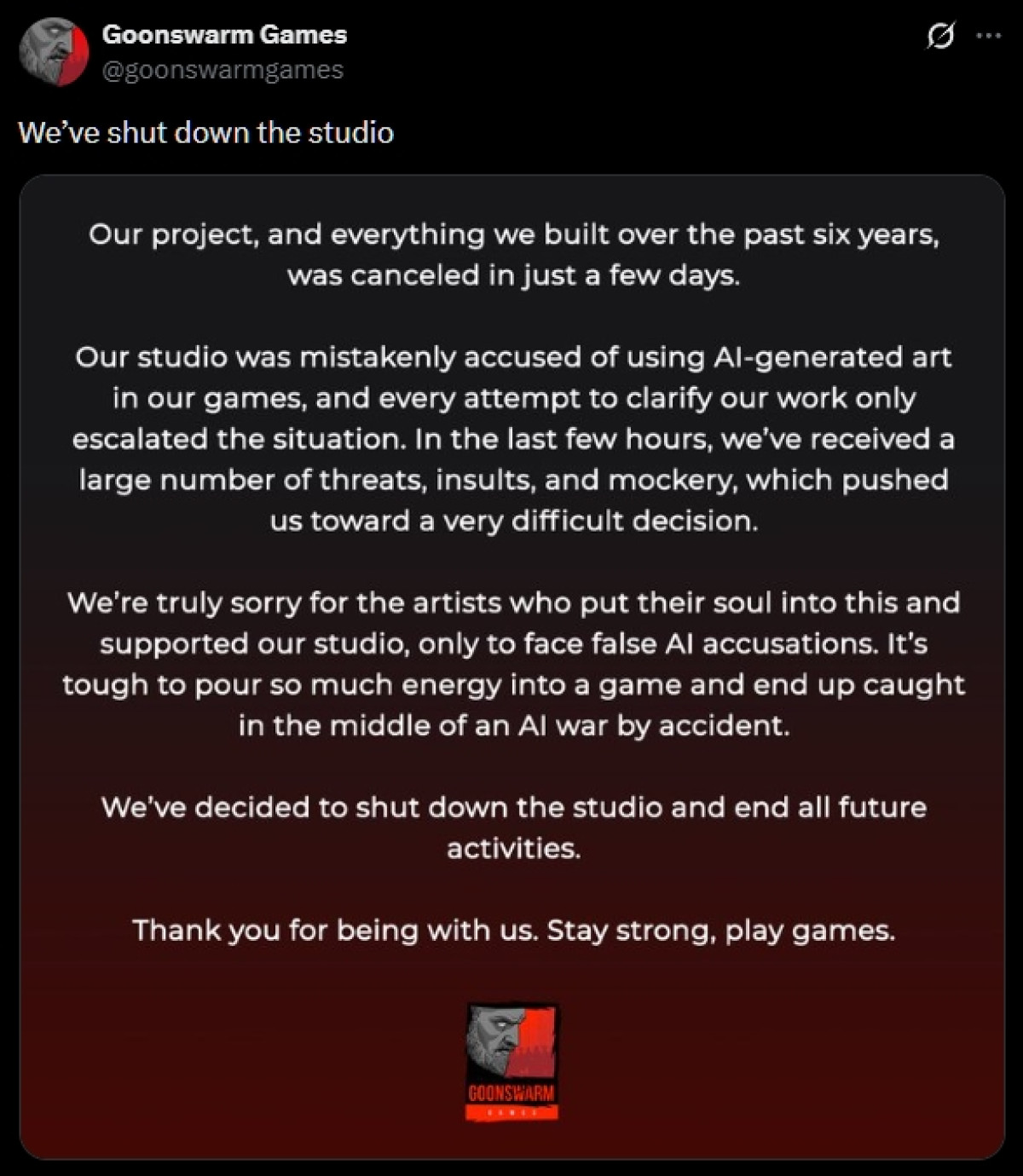 – Det er tøft å legge så mye energi i et spill og ende opp i midten av en AI-krig ved et uhell. Vi har bestemt oss for å stenge studioet og avslutte alle fremtidige aktiviteter.