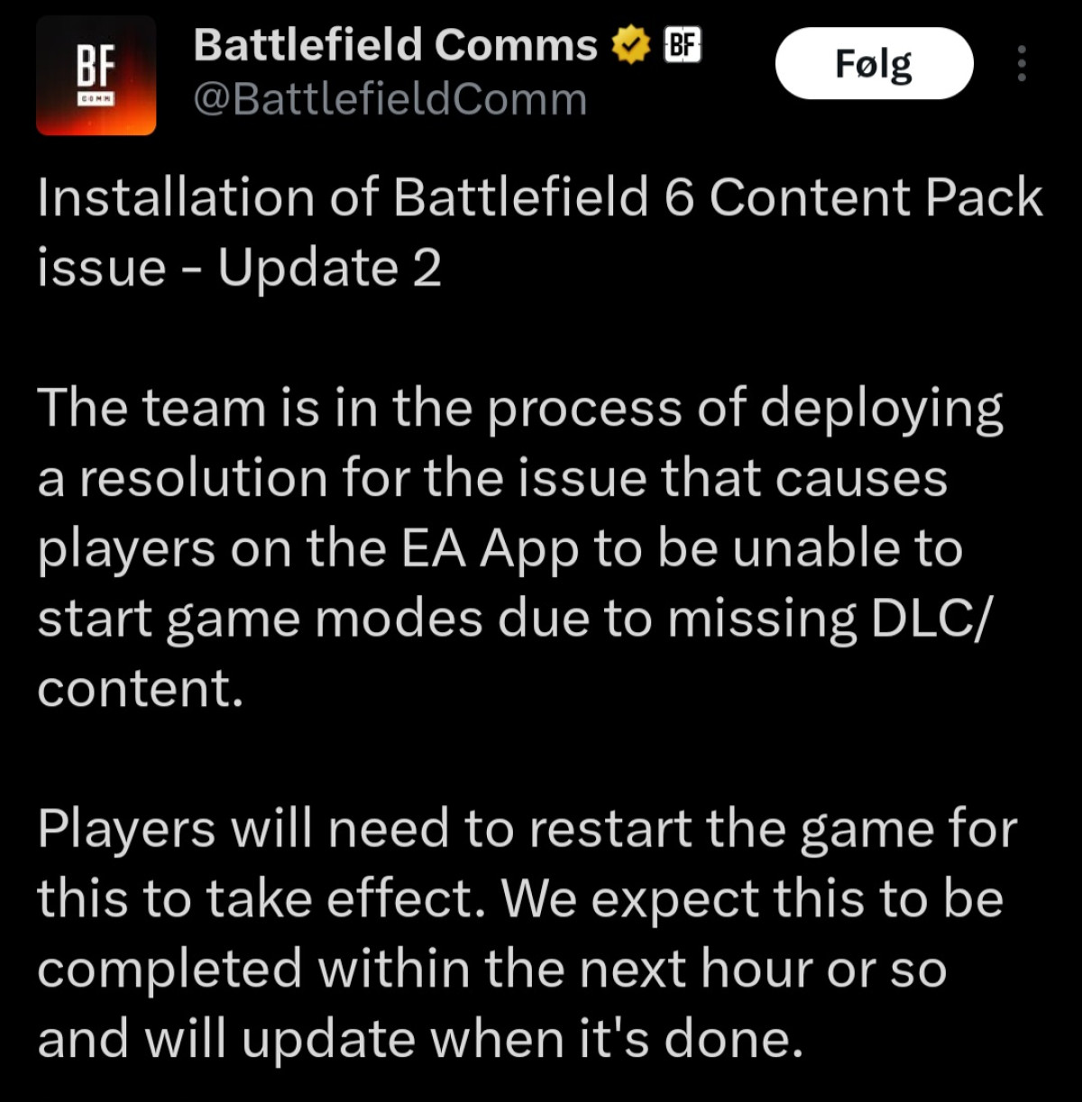 Utviklerne sier de har lagt ut en fiks for dette nå.