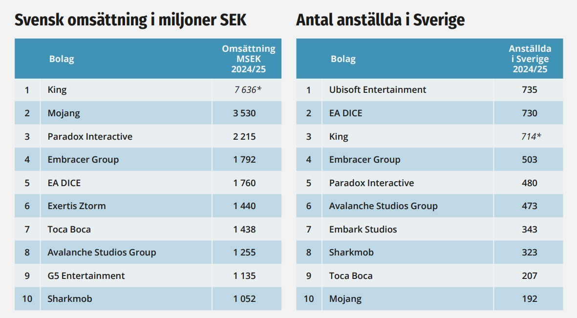 Bransjen domineres fortsatt av gigantene «Minecraft»-skaper Mojang og «Candy Crush Saga»-utvikler King, som til sammen omsatte for over 11,7 milliarder kroner i Sverige alene. Hvis man holder disse to utenfor regnestykket, var veksten for resten av den svenske spillbransjen på imponerende tolv prosent.