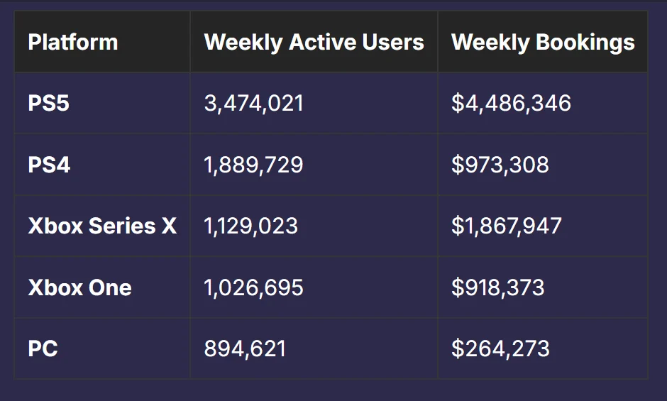 En annen interessant detalj er fordelingen mellom plattformene. PlayStation-spillerne står for den desidert største potten med nesten 4,5 millioner dollar i uka, mens PC-versjonen ligger på en overraskende sisteplass med knappe 264 000 dollar.