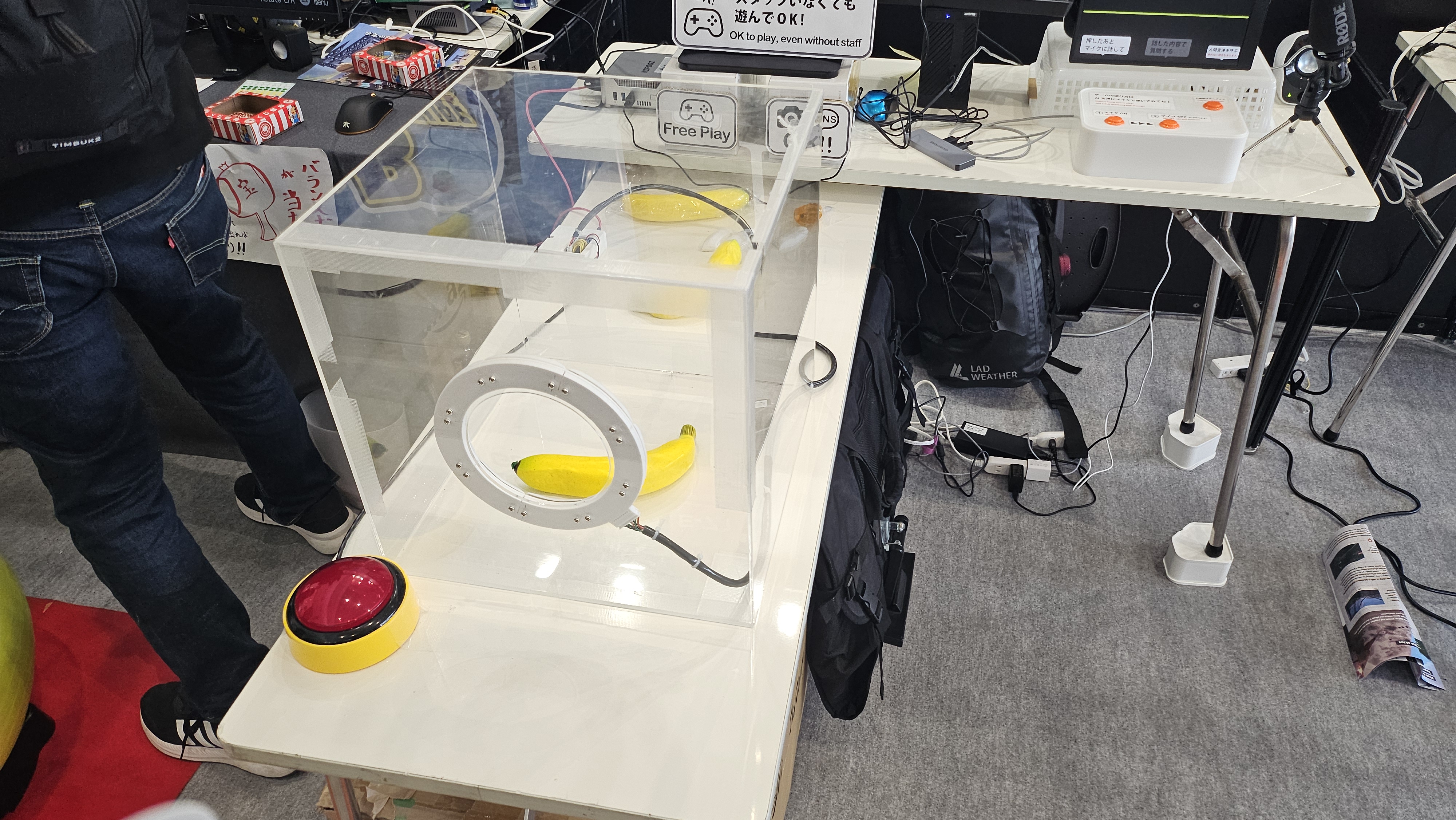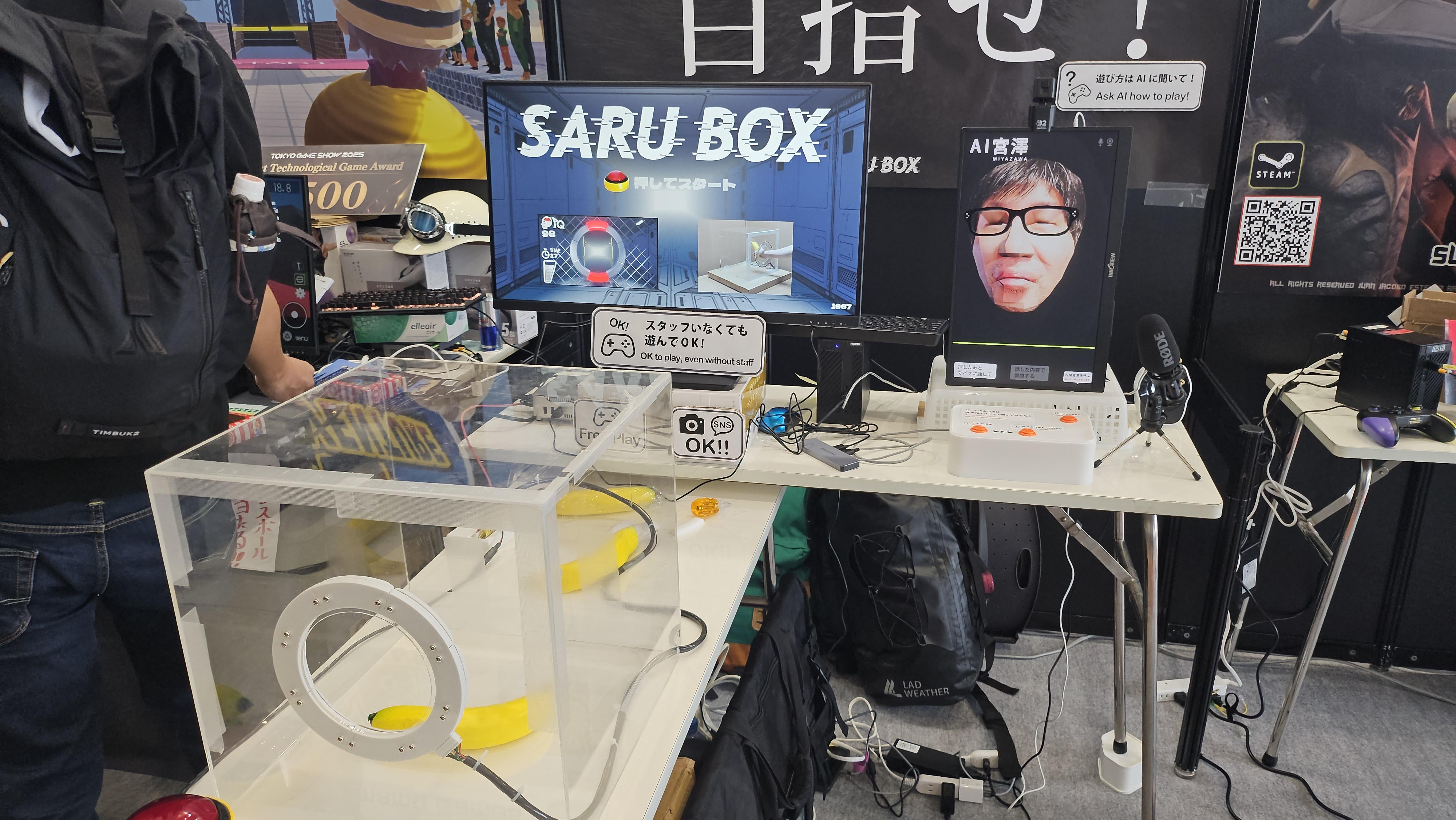 Utvikleren var derimot ikke der, men hadde satt fram en AI-versjon av seg selv til de som hadde spørsmål. Jeg spurte hva han røykte da han fant på spillet, og da lo AI-en og sa at han slett ikke røykte – dette var et eksperiment for å finne ut hvordan bananer kunne brukes mer i spill.