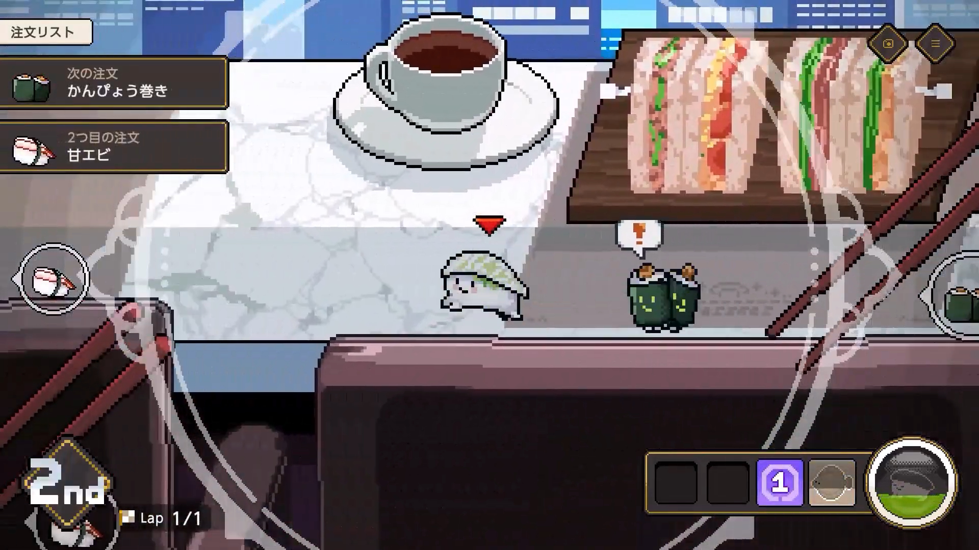 Du lager sushibiter med råvarer du handler inn, og disse bitene blir til levende søte små matbiter som du skal kappløpe med.