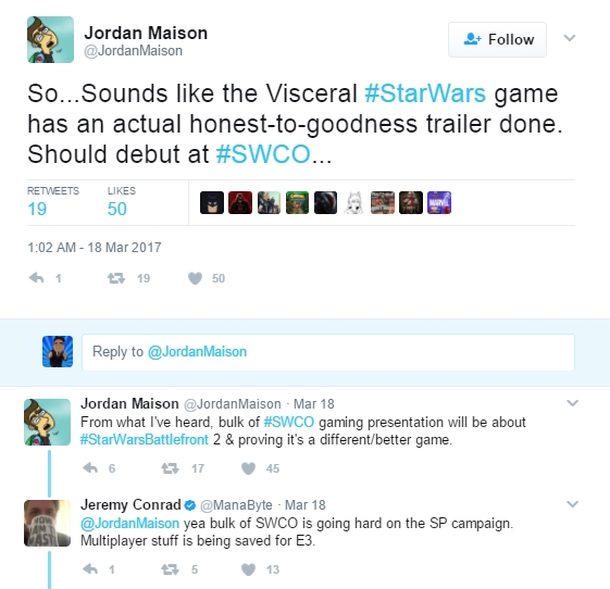 - Det virker som om Viscerals «Star Wars»-spill har en faktisk trailer klar. Skal visst debuteres på SWCO, skriver han på Twitter. Messa går fra 13. til 16. april.