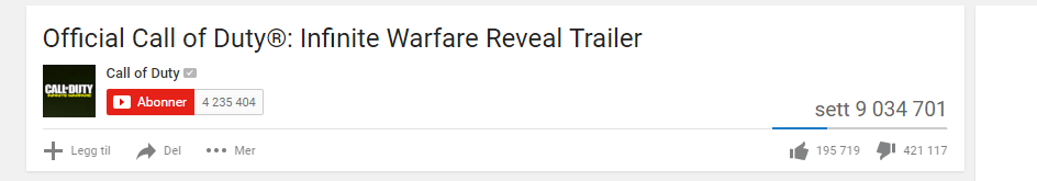 (PressFire.no): I skrivende stund har den ferske avsløringstraileren for «Call of Duty: Infinite Warfare» blitt sett nesten ni millioner ganger.