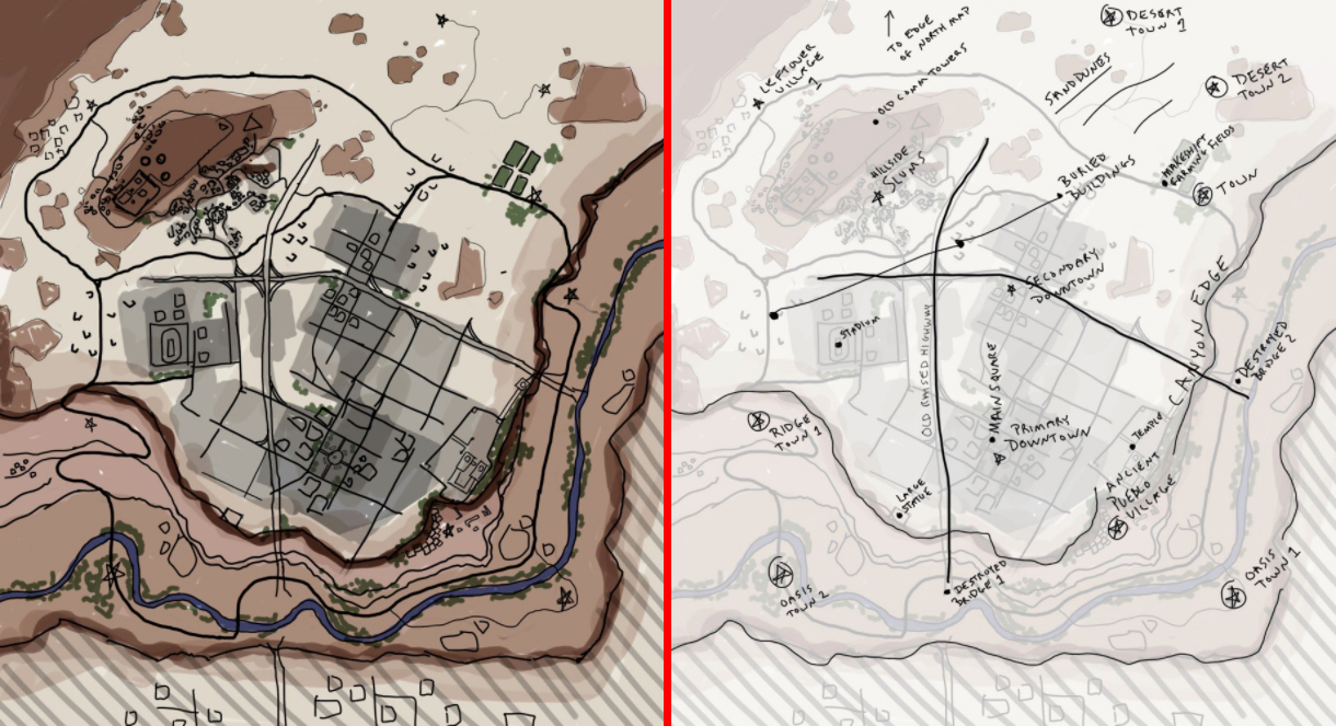 Vi har tidligere fått sett et par skisser av kartet, og et enkelt skjermbilde fra en del av kartet som var under tidlig utvikling, men dette er første gangen vi får se et overblikksbilde av den store byen som preger kartet.