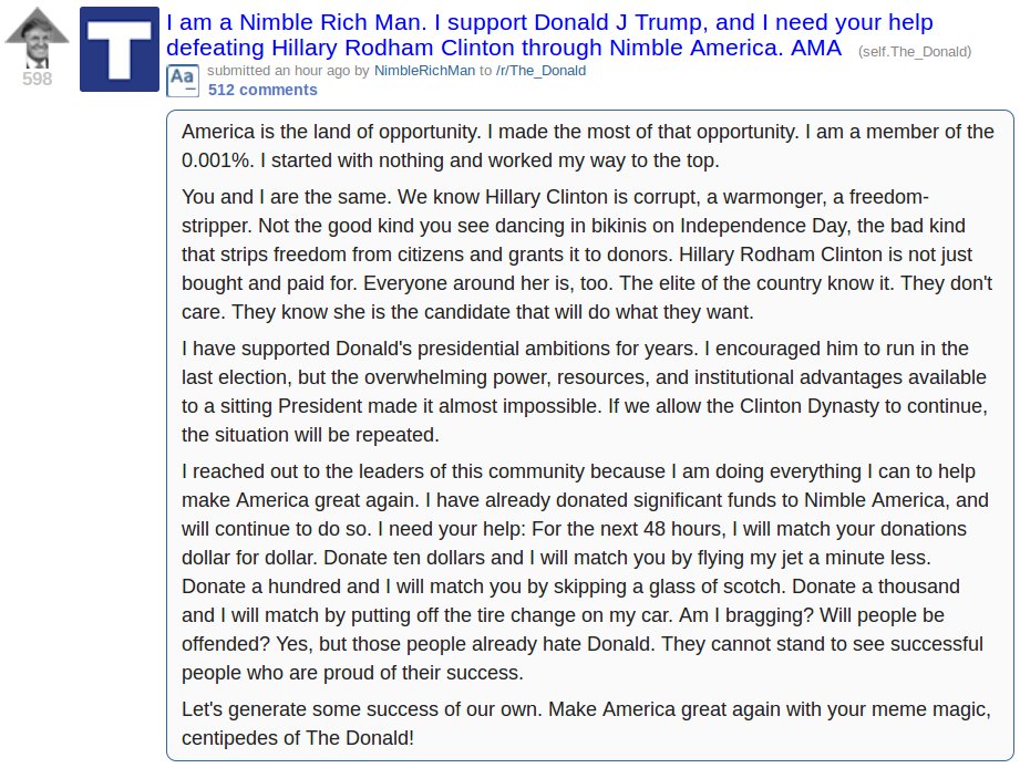I et innlegg på Trump-siden /r/The_Donald på reddit skriver han at «Hillary Clinton er korrupt og en krigshisser» før han kaller henne en «freedom-stripper» og påpeker at han ikke mener den typen som danser i bikini på Independene Day, men den dårlige typen.