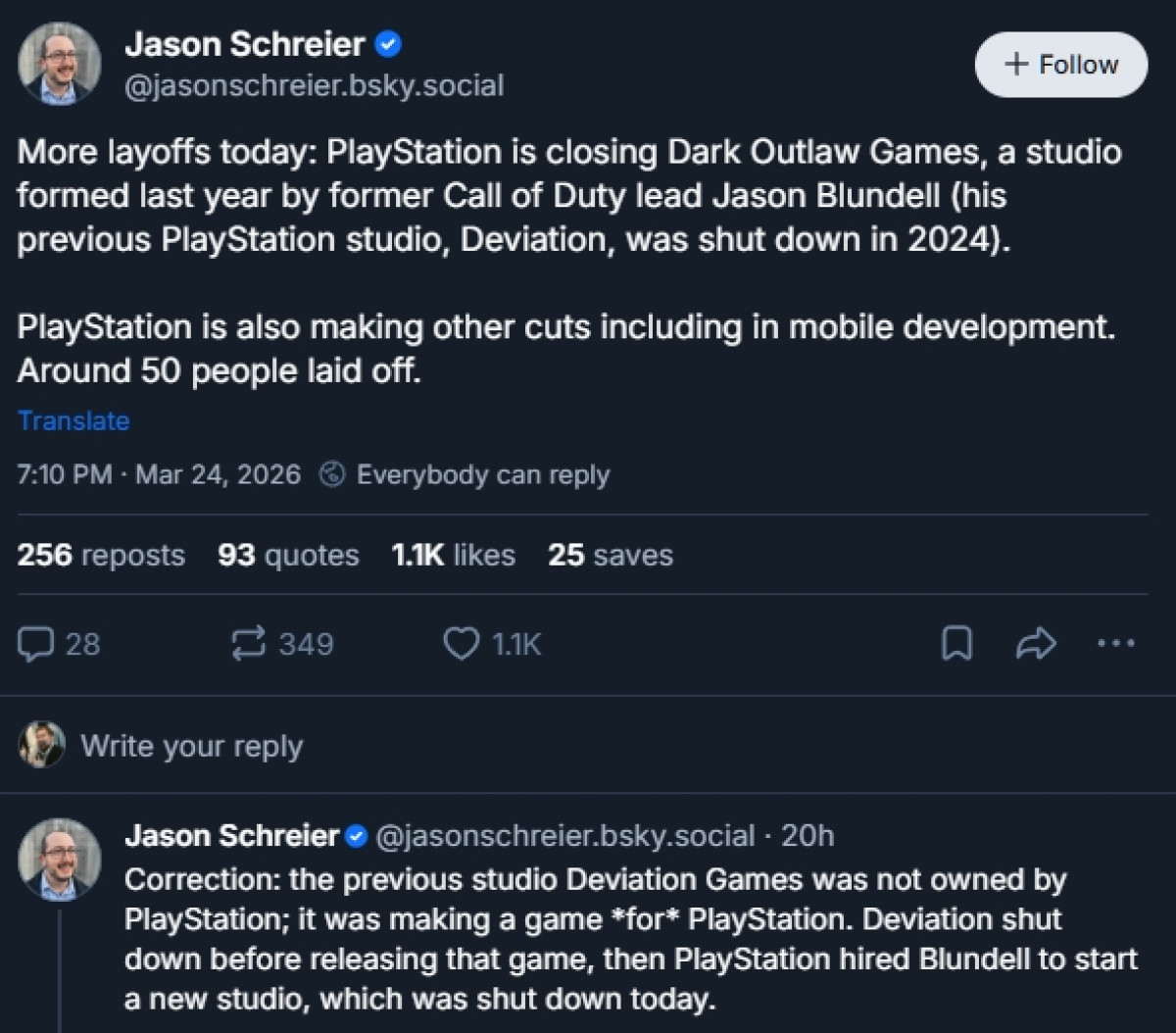 Dark Outlaw Games er nemlig det andre PlayStation-finansierte studioet hans som blir stengt. I mars 2024 ble også Deviation Games lagt ned, som jobbet på et spill for PlayStation.