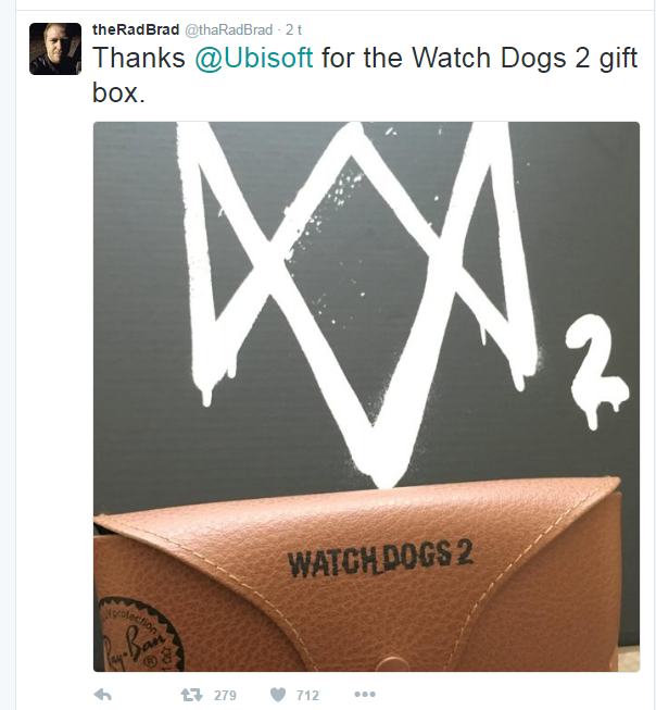 For skal vi tro YouTuberen TheRadBrad, så har han mottatt en gaveboks fra spillutgiveren med et par Ray Ban-briller som er tydelig merket med en «Watch Dogs 2»-logo på.