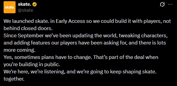 Reaksjonene fra fansen har ikke latt vente på seg, og sosiale medier har raskt fylt seg opp med kritikk. I et innlegg på Twitter forsvarte det offisielle «skate.»-teamet seg med at de utvikler spillet i åpenhet med spillerne under Early Access.