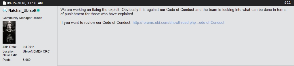 Men i tillegg til å oppdatere har Ubisoft gått ut på spillets offisielle forum og sagt at de holder på å undersøke hva som kan gjøres for å straffe de som har benyttet seg av feilen.