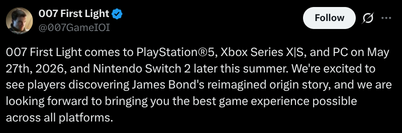 – «007 First Light» kommer til PlayStation 5, Xbox Series X/S og PC 27. mai 2026, og til Nintendo Switch 2 senere i sommer, skriver de på Twitter.