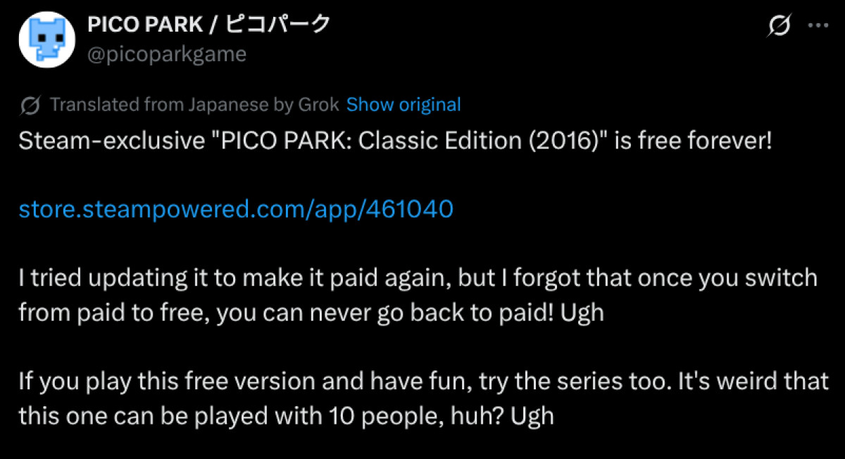 De oppfordrer videre de som liker gratisspillet til å sjekke ut det kommende «Pico Park 2».