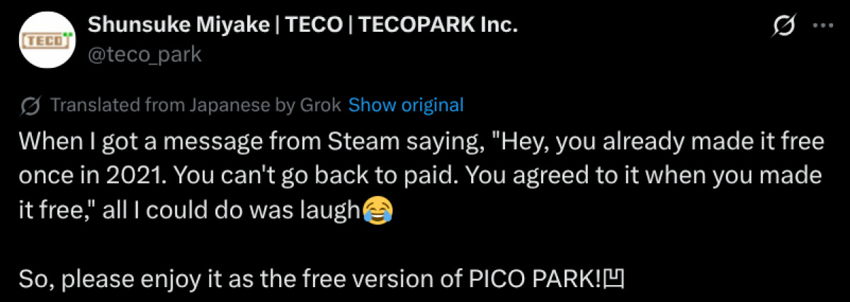 Tecopark-sjef Shunsuke Miyake skriver videre at han bare kunne le da han fikk mail fra Steam om at de ikke kunne ta betalt for spillet.