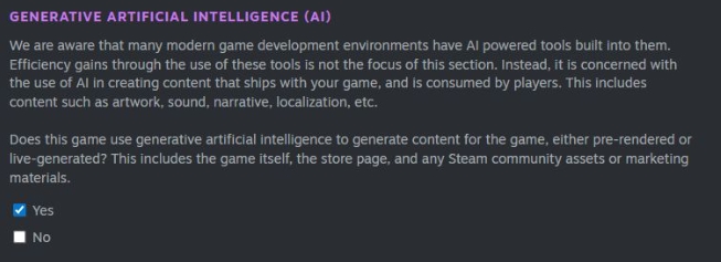 Det er først når teknologien brukes til å generere ting som grafikk, lyd eller historie at Steam krever at det opplyses om.