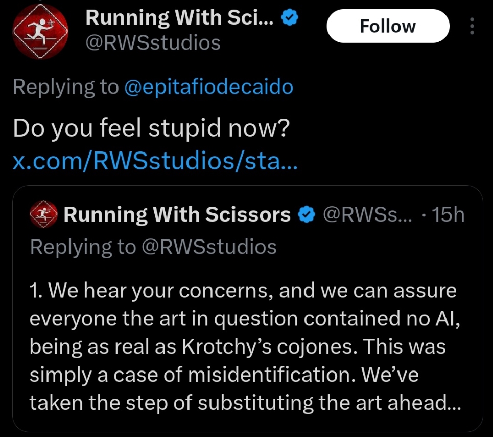 Bruken av AI gjelder også andre spill de har laget, tydeligvis – for de melder nå at de skal bytte ut alt AI-generert innhold i de andre spillene med noe laget av mennesker.