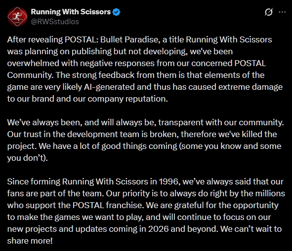 (PressFire.no): Det tok bare 48 timer fra annonsering til kansellering for «Postal: Bullet Paradise». Utgiver Running With Scissors måtte trekke i nødbremsen etter at fansen reagerte på spillets utstrakte bruk av AI-generert innhold.