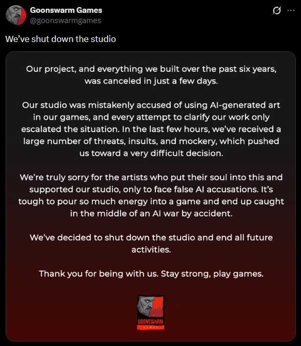 Timer senere annonserte nemlig utvikler Goonswarm at de plutselig har lagt ned hele studioet. På Twitter skrev studioet at alt de har laget de siste seks årene «er blitt kansellert på bare noen få dager».