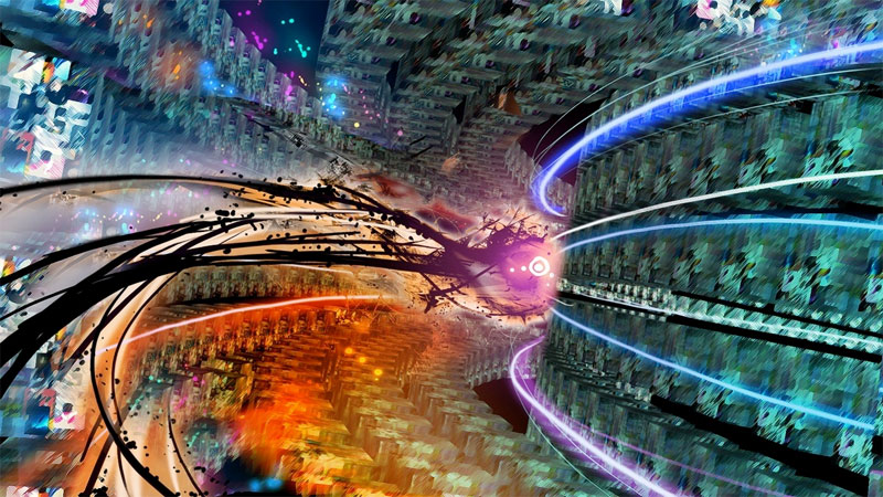 Tidvis får du oppleve følelsen av å suse nedover trange, hektiske korridorer der fiendene dukker opp i rytmiske formasjoner - men i neste sekund spyttes du ut i store, åpne fantasilandskap der form, farger, lyder og lys flyter sammen til en strålende, sanselig sensasjon.