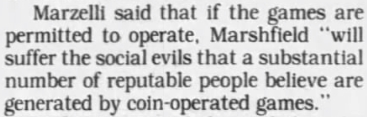 På den andre siden slo derimot Marshfields advokat Marzelli tilbake med den samme retorikken om at spillingen forkludret sinnet til barn og unge, og at de ikke nøt godt av å møtes rundt arkademaskinene.