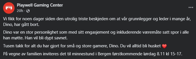 – Det er vanskelig å utrykke hvor mye betydning han har hatt for spillkulturen gjennom sine år, han har nådd ut til så mange gjennom sine år som frivillig og i hans karriere for å skape møteplasser for både barn, unge og voksne, skriver GG Bergen.