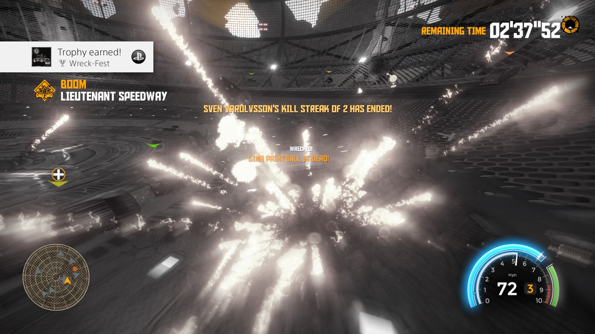 Som nevnt tidligere er det også en egen «demolition derby»-modus her, hvor det handler om å knuse motstanderne. Den plastikk-aktige fysikken og skademodellen gjør også her noe potensielt morsomt til en trist og stakkato affære.