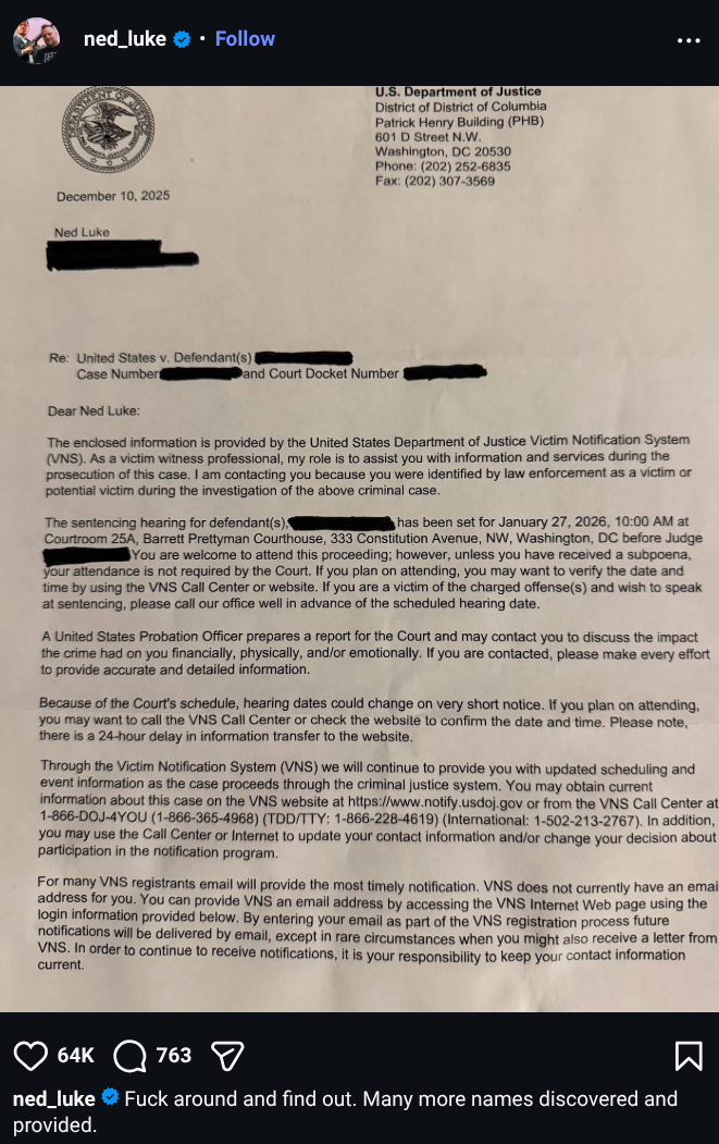 I et innlegg på Instagram varsler Luke at minst én av personene som står bak swattingen nå står overfor føderale anklager i USA, med en rettssak berammet til januar 2026.