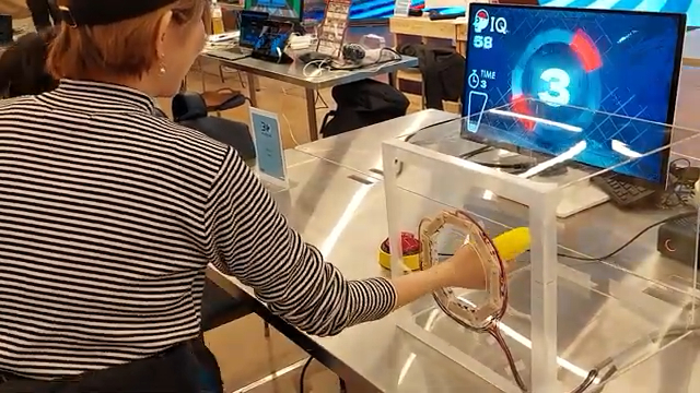 Rundt hullet i boksen var den en rekke brytere som registrerte hvilken vinkel bananen hadde i det jeg slo den mot kantene – og på skjermen kom det opp hvilken vinkel den skulle ha i ren Guitar Hero-stil.