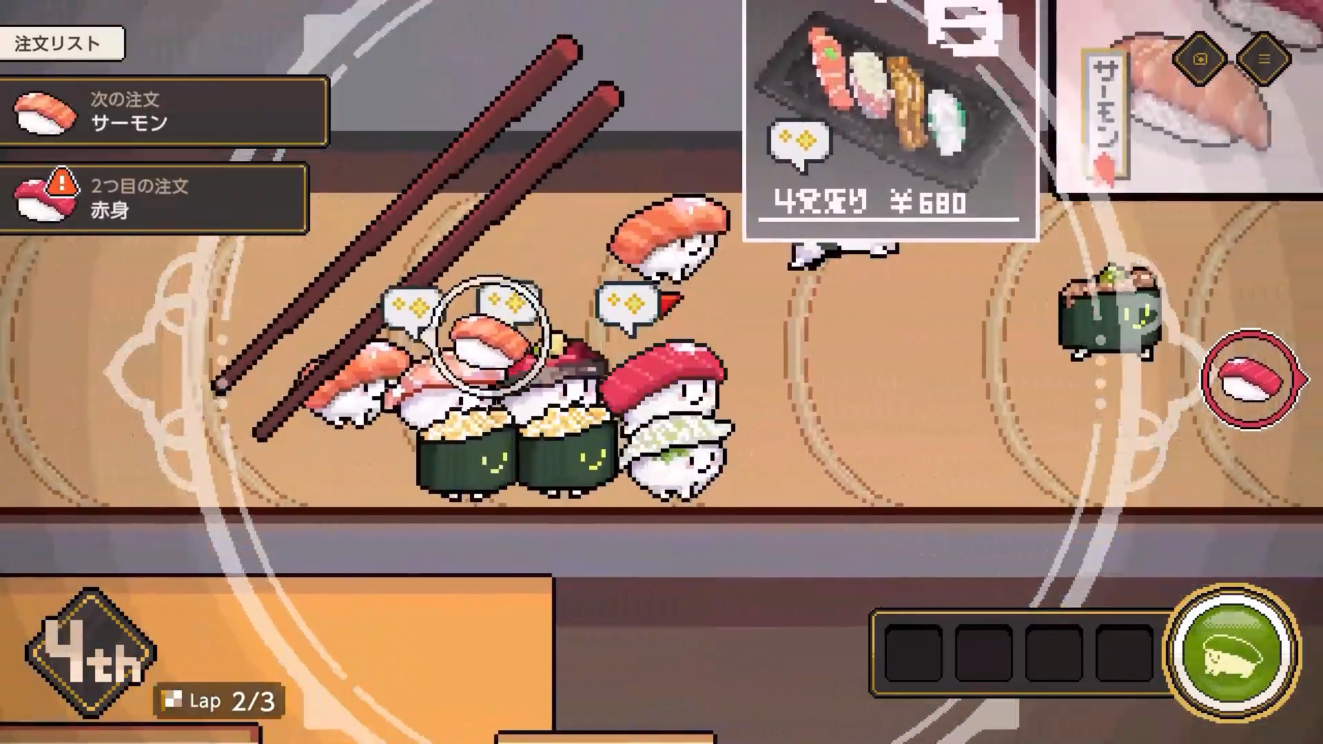 Du lager sushibiter med råvarer du handler inn, og disse bitene blir til levende søte små matbiter som du skal kappløpe med.