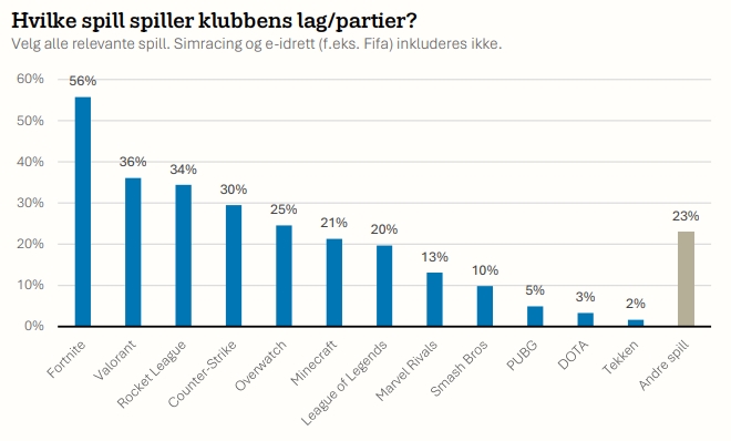 Når det gjelder hvilke spill det går i, er «Fortnite» den tittelen flest klubber har et tilbud i – over halvparten av de spurte. Deretter følger «Valorant», «Rocket League» og «Counter-Strike».