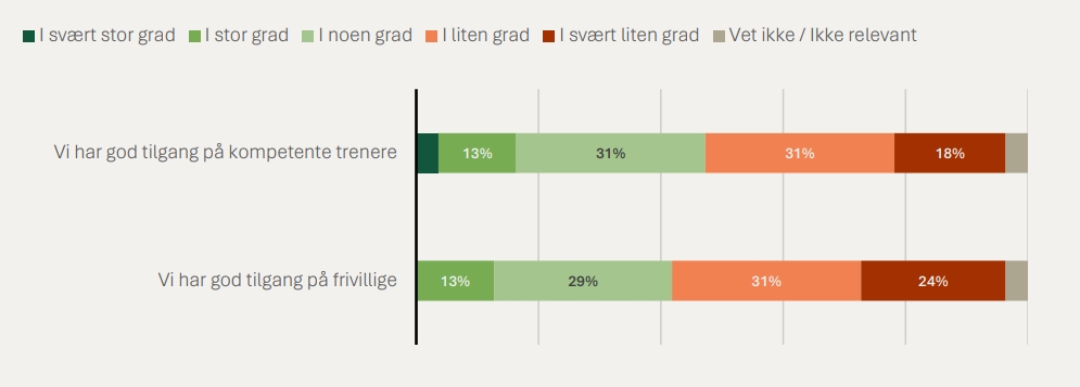 Mens de fleste klubber har tilgang på lokaler og utstyr, er den største mangelvaren mennesker. Rapporten peker på en kritisk mangel på kompetente personer. Over 90 prosent av klubbene drives av frivillige, og rekruttering beskrives som svært krevende.