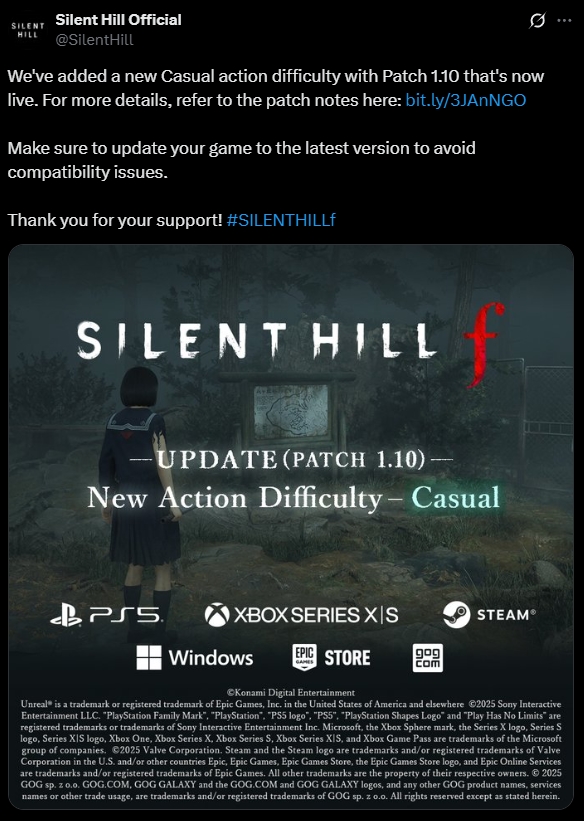 (PressFire.no): Etter vedvarende kritikk mot et tidvis frustrerende kampsystem, har Konami og utvikler NeoBards sluppet en oppdatering til «Silent Hill f» som skal gjøre livet i tåka litt enklere.