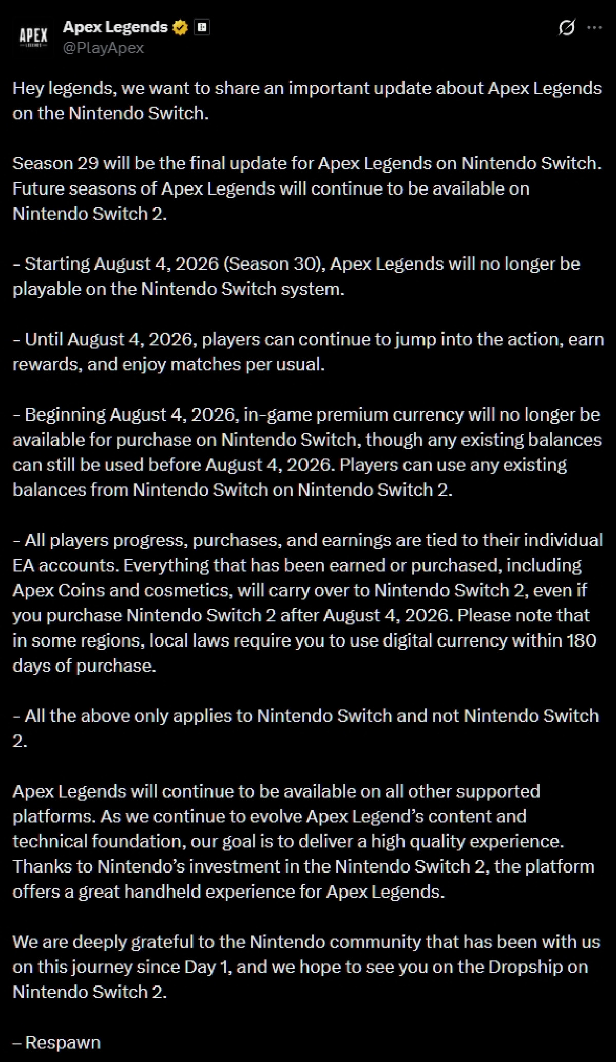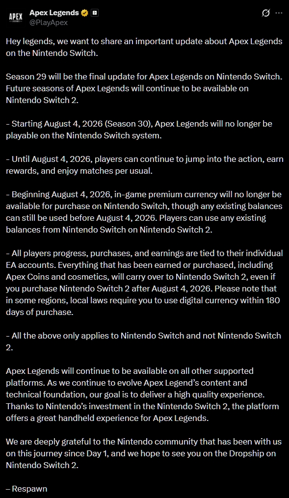 (PressFire.no): Respawn Entertainment har kunngjort at «Apex Legends» ikke lenger vil støttes på den originale Nintendo Switch-konsollen etter sesong 29.