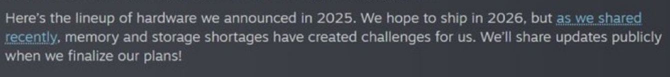 – Her er oversikten over maskinvaren vi kunngjorde i 2025. Vi håper å kunne levere i 2026, men som vi nylig informerte om, har mangel på minne og lagringsplass skapt utfordringer for oss. Vi vil informere offentlig når vi har ferdigstilt planene våre!