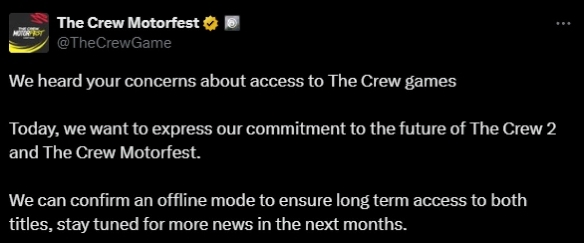 I en kunngjøring på sine nettsider skriver utvikleren at den nye modusen skal sørge for at «The Crew 2» forblir tilgjengelig i flere år fremover, enten du vil sikre progresjonen din for fremtiden eller bare nyte friheten ved å spille uten nettilkobling.