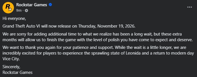 Utsettelsen er på nesten et halvt år fra den forrige datoen, som var 26. mai 2026. Den opprinnelige planen var at spillet skulle lanseres i løpet av 2025, men det ble altså først dyttet til våren 2026 – og nå til senhøsten samme år.
